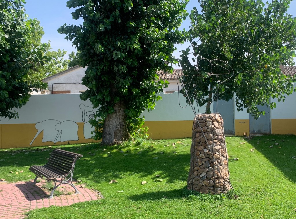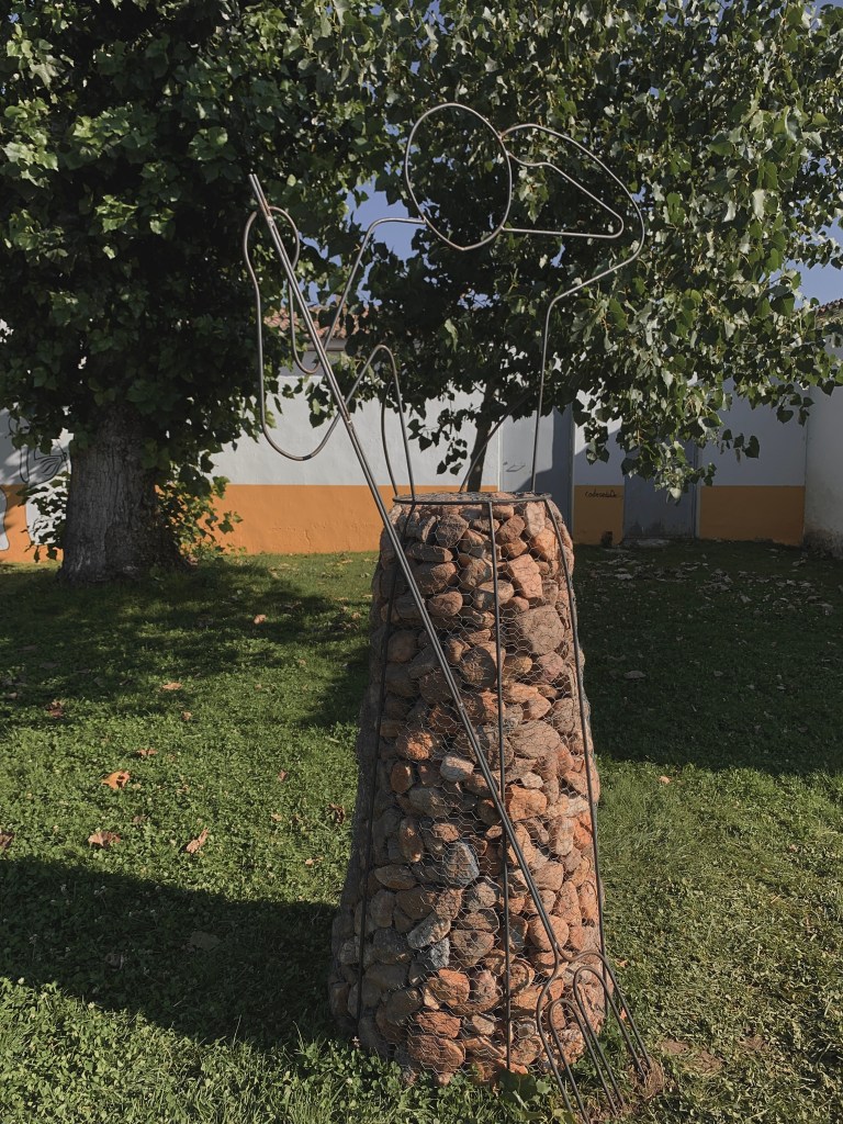 La escultura, inspirada en las actividades de trabajo del campo de las antiguas generaciones del pueblo. La llamada «Hera» lugar a cielo abierto con suelo empedrado donde se almacena la cosecha tras su recogida. Las mujeres a menudo labraban estas tierras trillando y amontonando la cebada y el trigo. Las piedras buscan ligar al campesino con el campo.