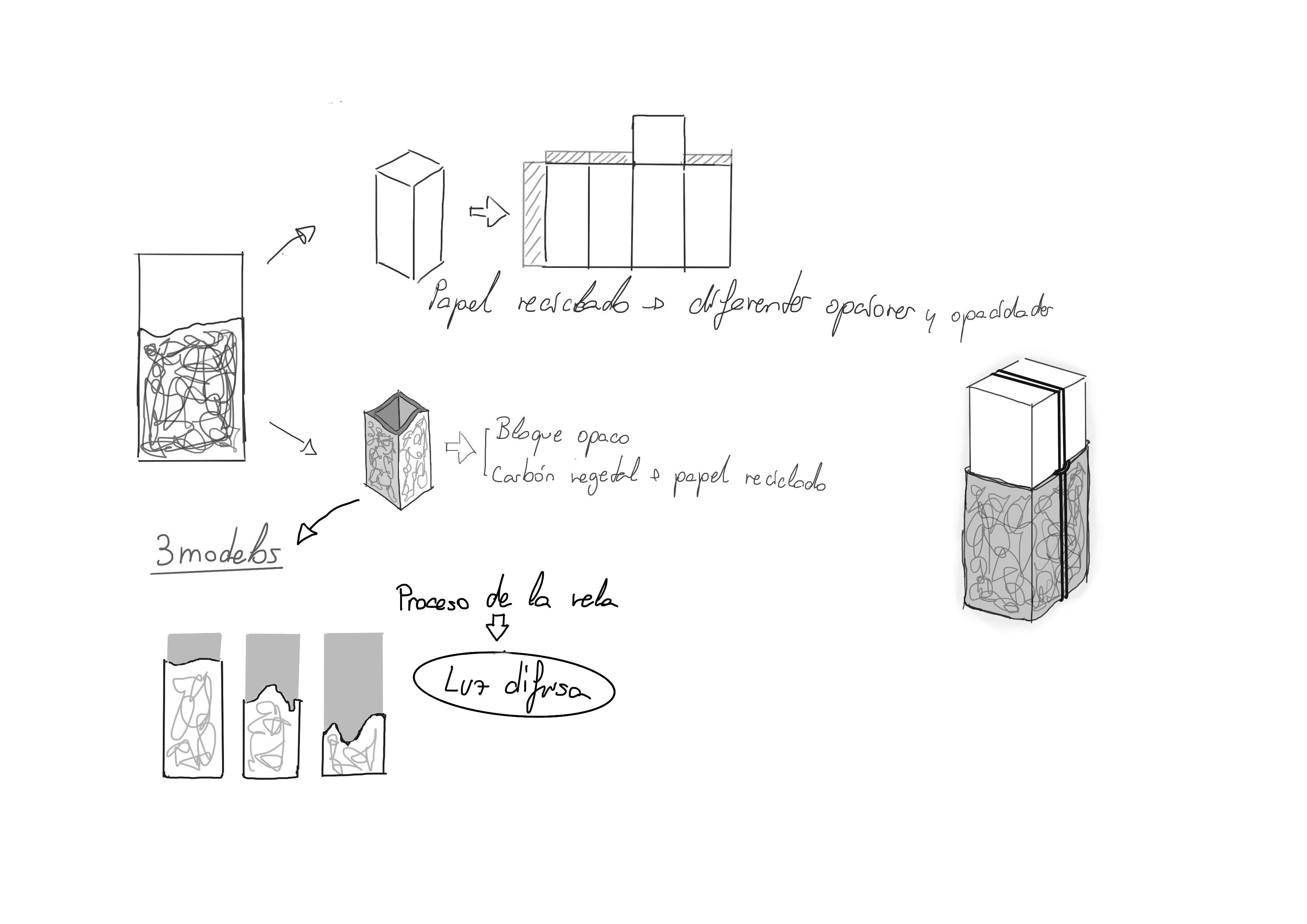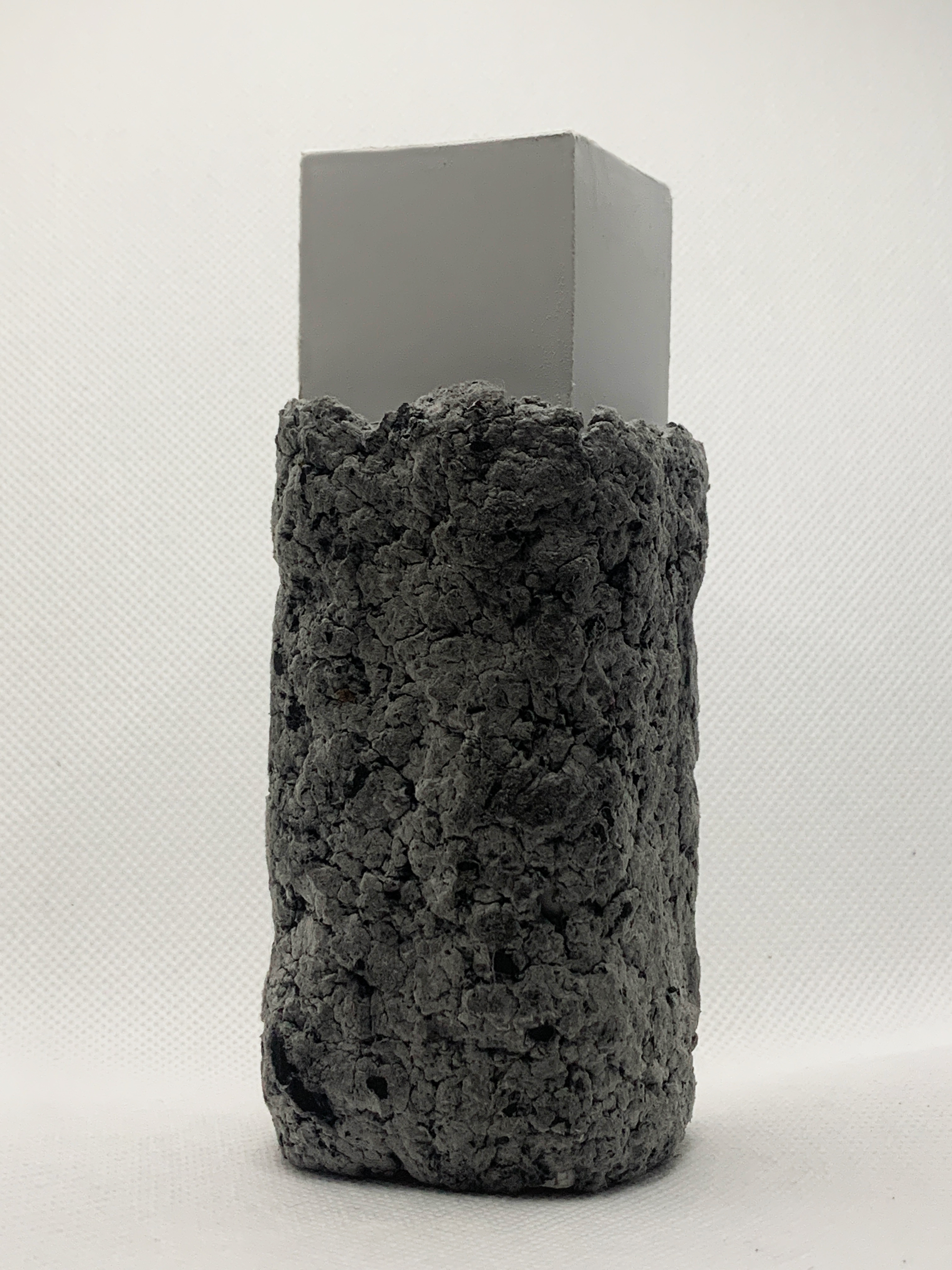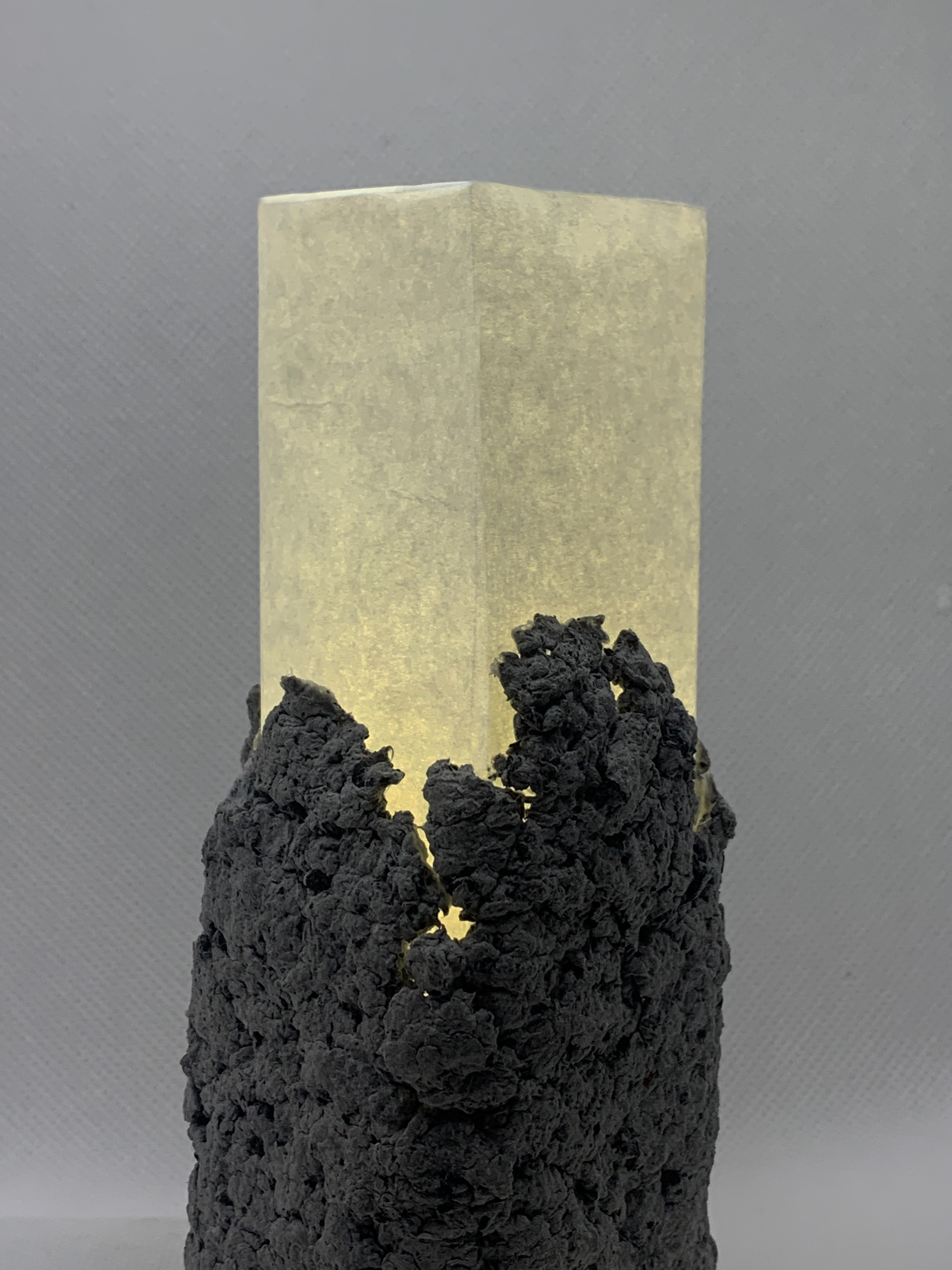 Pieza realizada con papel reciclado y carbón vegetal. Se emplea como luminaria alternativa, similar al uso de una vela.