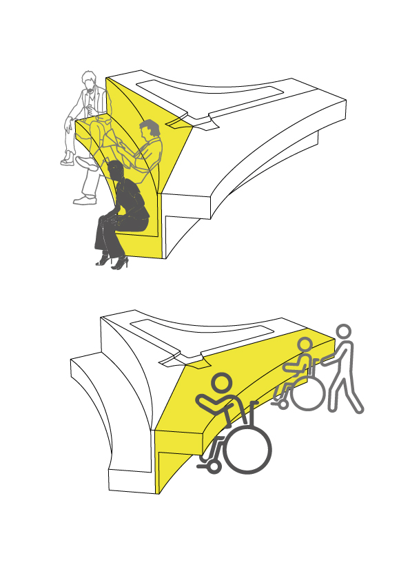 Mobiliario público de tres piezas que los usuarios pueden disponer bajo su conveniencia, transformando el espacio, además pueden variar las piezas pudiendo utilizarse como banco o mesa, incluso ambas. Además busca la accesibilidad de personas con movilidad reducida, bajo los principios del diseño universal.